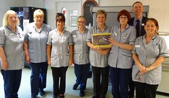 Pictured with the CAP award are team members, Ruth Pope, Sandra Edwards, Wendy Hayden, Karen Regan, Angie Sullivan, Julie MacDiarmid, Dan Stonell (Hospital Director) and Tracy Cunningham
